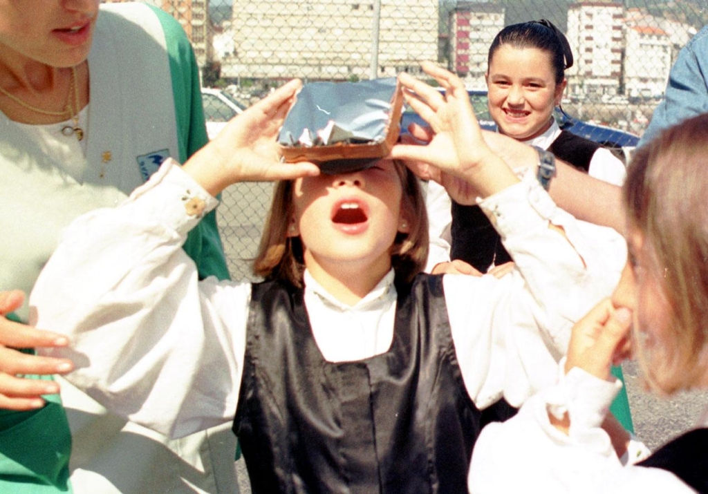 Nena mirando un eclipse en Sta Uxia de Ribeira a través dun espello solar.