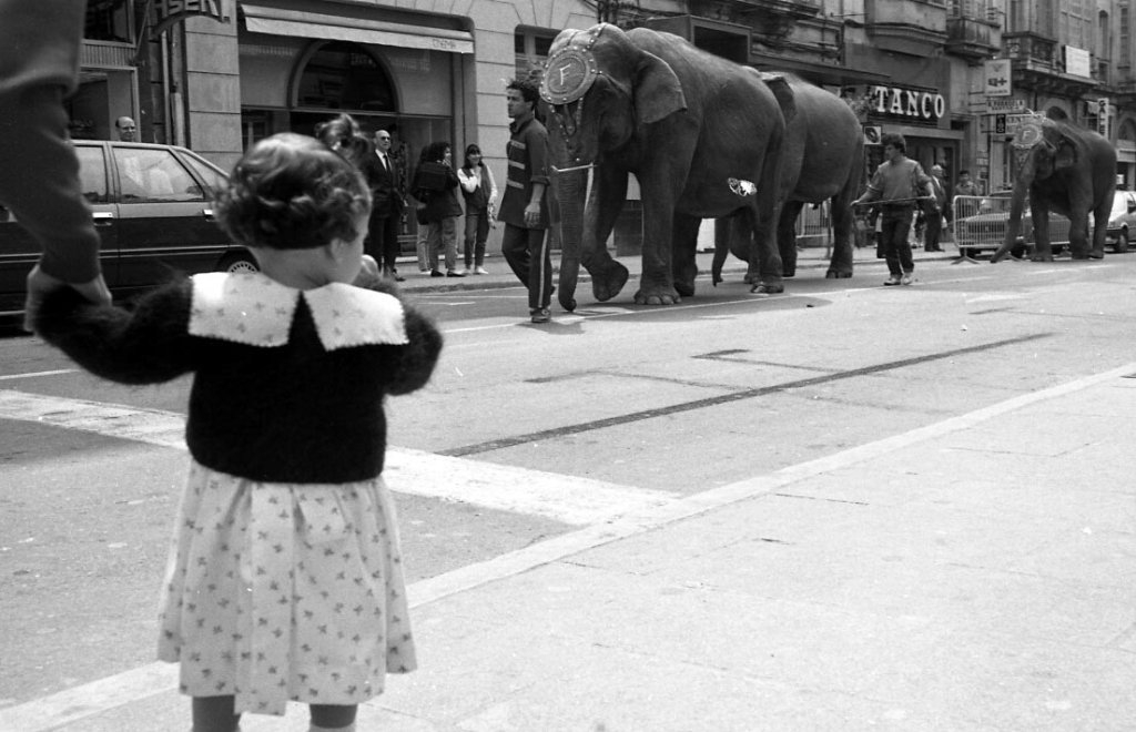 Elefantes dun circo paseando polas rúas de Ourense en 1990.
