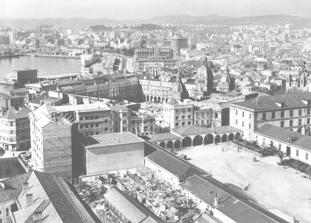 Vista da Coruña: Praza de María Pita e o antigo cuartel, 1959