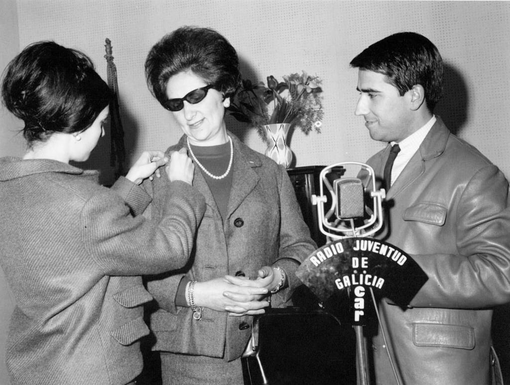 A vendedora de billetes máis simpática dos cines coruñeses é condecorada en Radio Juventud polo locutor José María Comesaña, en 1966